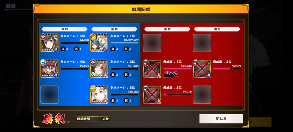 気力が足りないので時間がかかってるけど戦闘記録によるとクリア時間は5秒だそうです。時空の乱れ。