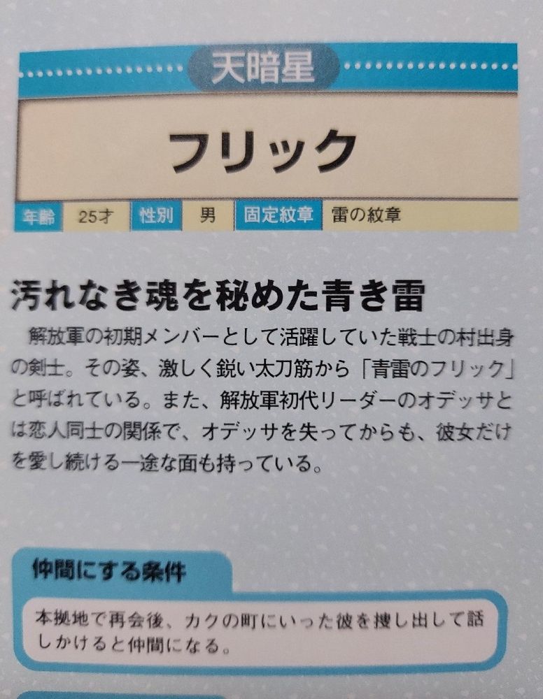 幻想水滸伝「時代の星星に導かれてリーダーの元に集まった108人」みたいなコンセプトの良いところ、ナンバリングによって主人公と主人公の立ち位置が変わるため前作で(プレイヤーから見て)仲間キャラクターだった奴が新作では敵陣営にいたり、逆に毎回敵陣営にいた奴が特定の話では108星の一人だったりするというのがあるんだけど、それって一人ひとりに立場とか人間関係とか都合があって、全員が各々の人生の主役だという話でもあるので、世界観に厚みが出てるし背景がすごく豊かなんだよね。